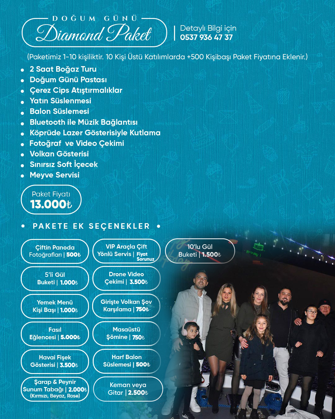 Denizin üzerinde eğlencenin doruklarına çıkabilir kendinizin veya sevdiklerinizin doğum gününde keyfi en küçük zerresine kadar hissedebilirsiniz.Yatta doğum günü turlarınızı ister yemekli tur sonrası ister kokteylli tur sonrasında veya aynı anda gerçekleştirebilirsiniz. İsteğe göre seçtiğiniz özel kelimeleri lazer eşliğinde boğaz köprüsüne yansıtarak da gerçekleştirebilirsiniz.